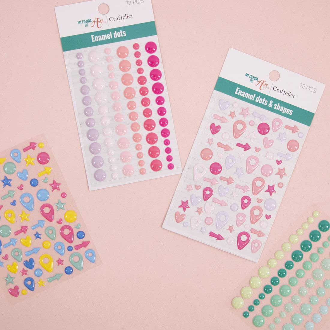 - 📄 DESCRIPTION: Enamel Dots and Shapes by Craftelier Basics are mini self-adhesive pearlescent stickers that simulate paint drops with different circles and shapes, the perfect complement for decorating scrapbooking and craft projects. Available in different colours (winter, summer, pastel colours, etc.).