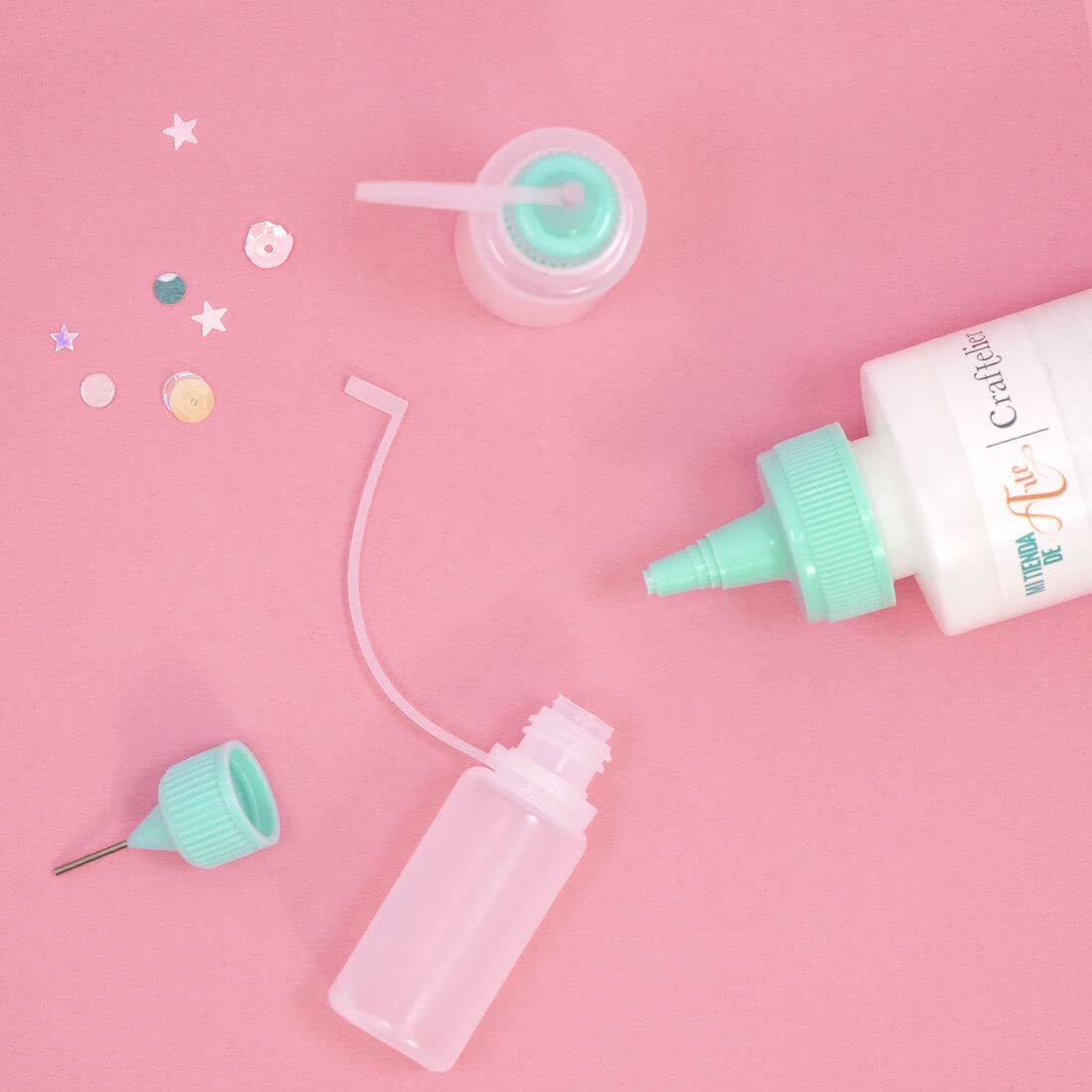 - 📄 DESCRIPTION: Kit of two small bottles in two sizes, 8 cm and 9 cm, to fill and apply your favorite products such as glue, acrylic paint, alcohol inks, etc. They are perfect for sticking ornaments and small or fine things. Its small nozzle allows you to apply these products with complete precision, also avoiding the dripping of liquids.