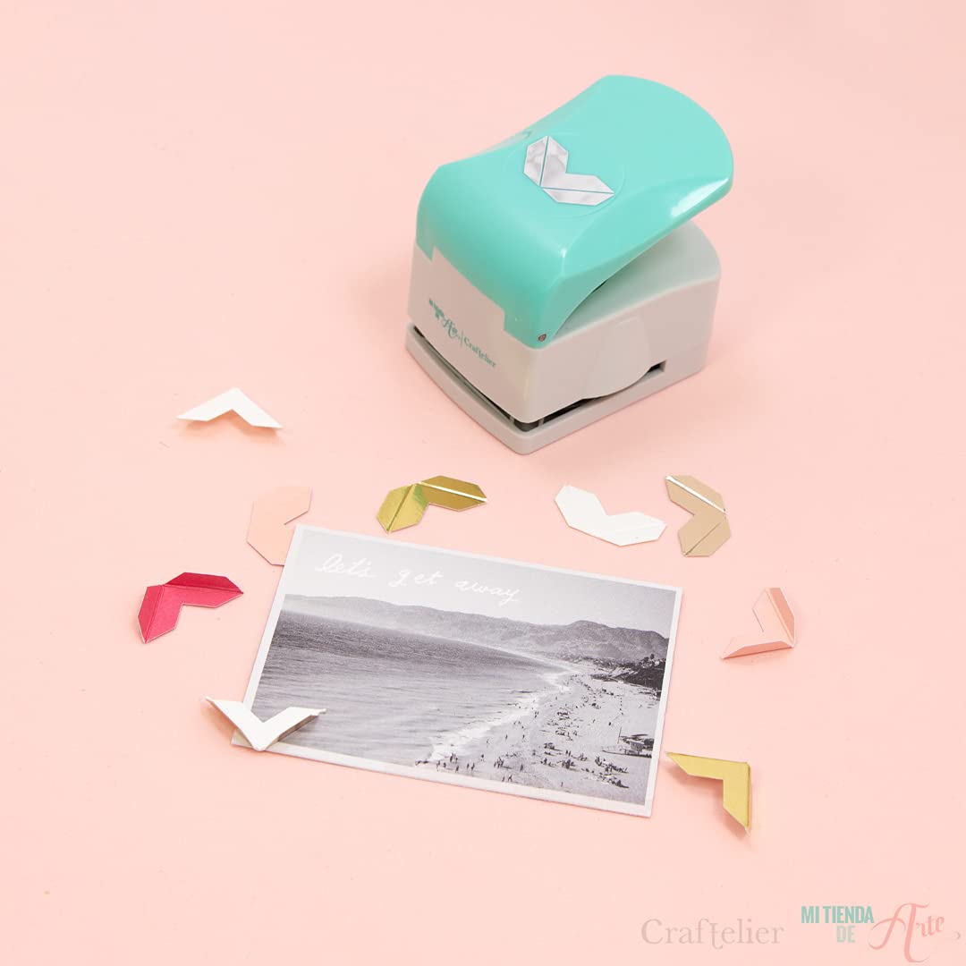 - 📄 DESCRIPTION: Craftelier Basics corner punch for paper and cardboard, in cream and turquoise color, with a basic press lever shape. This punch cuts and makes a fold, all we have to do is fold them along the fold and we will have our corner pieces ready with our favorite papers. They are perfect for adding volume to the images and when we do not want to paste the photographs directly on the paper or for albums.