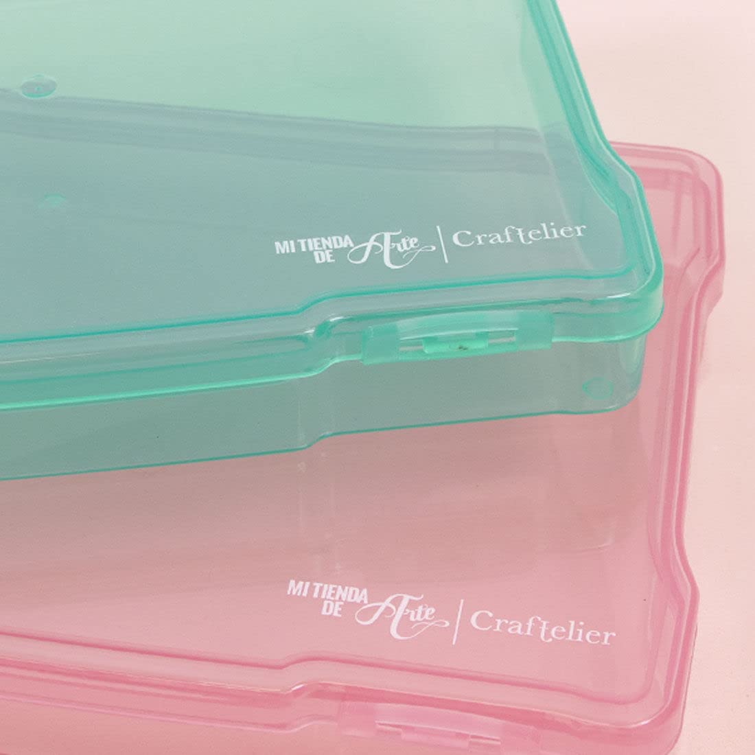 Craftelier - Set of 2 Organiser Boxes for Scrapbooking and Craft Materials | Approximate Size 19.8 x 14.6 x 3.1 cm (7.80" x 5.75" x 1.22") - Translucent Pink and Turquoise Coloursโ