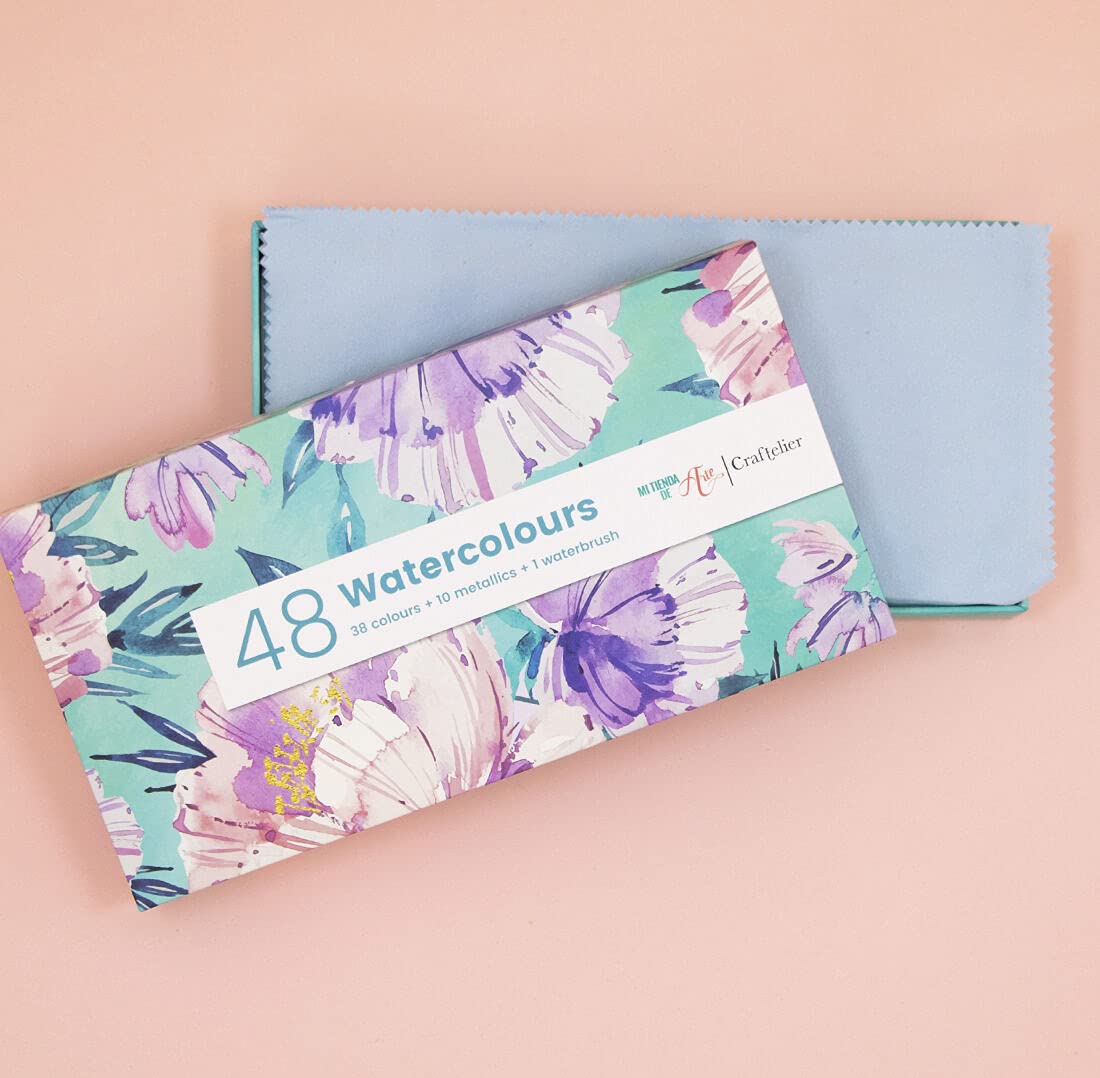 - 📄 DESCRIPTION: Box of assorted watercolours with 48 colours, 10 of which have a metallic finish. Includes a brush with water reservoir. The watercolours are presented in a metal box, which will allow us to take our watercolours anywhere without fear of damaging them.